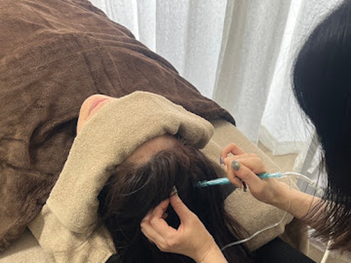 高水圧のマイクロジェットで頭皮をケアします。毛穴の汚れを除去し、育毛剤の浸透を助けることで、育毛効果を高めます。頭皮の清潔化、たるみ予防、抜け毛予防に効果的です。施術は冷たい感覚があるかもしれませんが、多くのお客様が快適だと感じています。